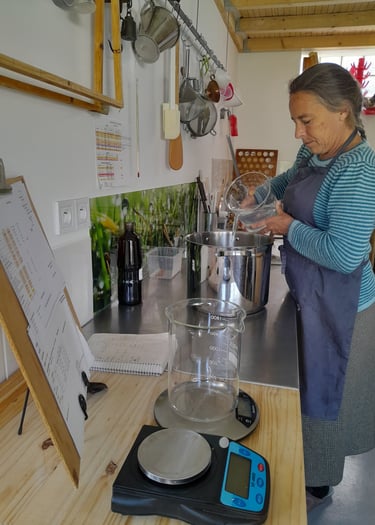 Ensuite vient le calcul du poids de soude et du pourcentage d'eau mis en œuvre à la fois pour transformer l'huile mais aussi pour en maintenir un part non saponifiée qui sera disponible pour la peau.